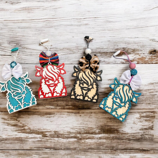 Chunky Highland cow Infused Car Charm, Highland cow Smelly Charm, Scented Infused, Wooden Scented Charm, Cute Cow with bow Wooden Car Charm