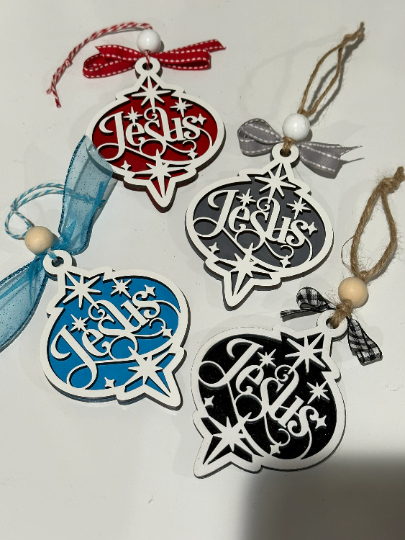 This beautiful wooden ornament is available in several options. It is double layered and each piece is cut of 1/8" material. It makes the perfect addition to any Christmas tree!