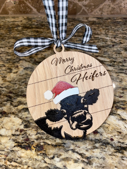This ornament measures 4" in diameter, consists of two layers of painted cow and natural wood as shown in the picture