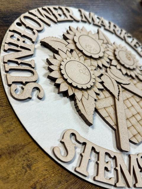 This unfinished Sunflower Market door hanger kit allows you to add a personal touch to your décor. The DIY kit includes everything pictured, and the back is cut from 1/8” Birch. Perfect for painting and customizing to fit your style. If you’re interested in bulk orders, please contact me directly for more information. Ideal for seasonal home decorations or gifting, this sunflower-themed project is great for DIY enthusiasts looking for a creative project.